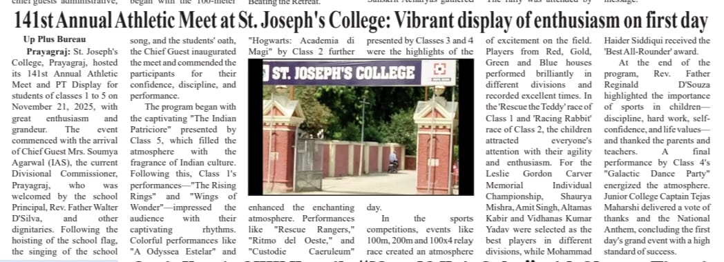 The year 1884 marked the genesis of an enduring legacy in the heart of Prayagraj, as the Capuchin Friars laid the cornerstone of St. Joseph’s College. Guided by the resolute motto ‘Semper Sursum’—Always Aim High—it stands today not only as an architectural marvel of the city but as a thriving community of nearly 7,000 scholars.Upholding this illustrious tradition, St. Joseph’s College organised Day One of the Post Centenary 141st Annual Athletic Meet and P.T. Display on the 21st of November, 2025. The event was a celebration of a sesquicentennial era defined by excellence, determination, and holistic development.