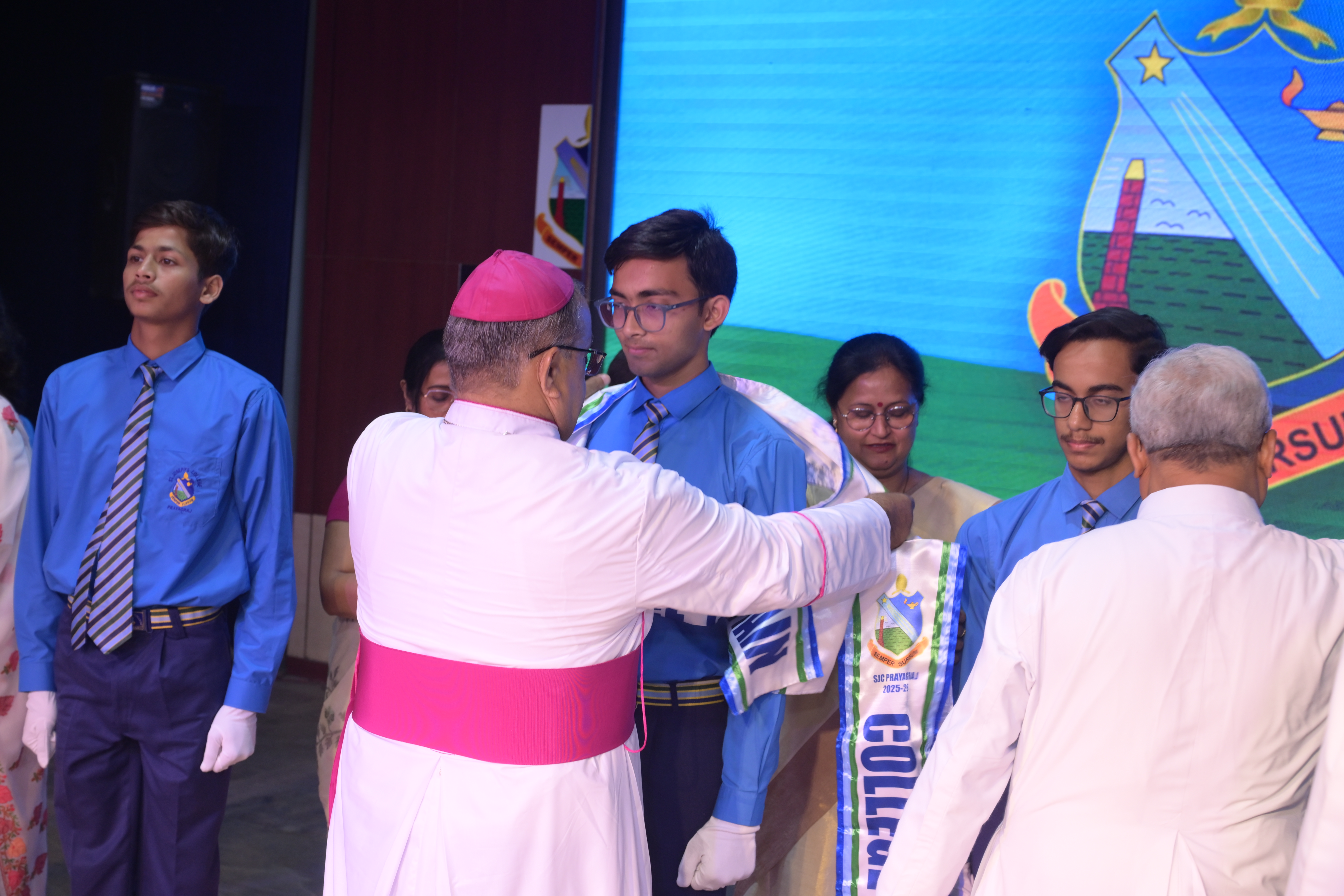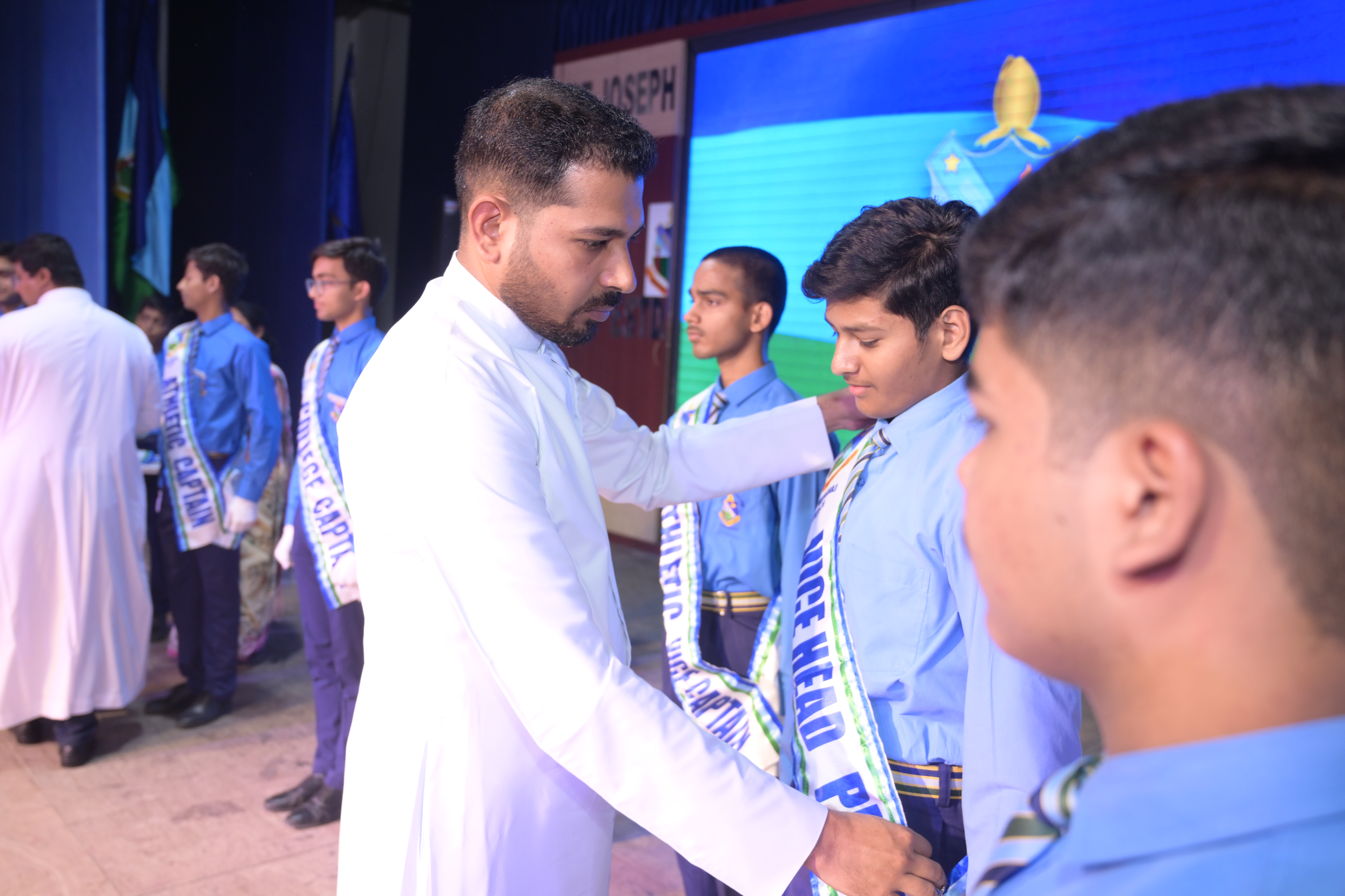 Mrs. Madhulika D’Souza, the Mistress of Ceremonies, welcomed the Chief Guest, Most Rev. Bishop Louis Mascarenhas, along with the Principal, Rev. Fr. Walter D’Silva, Headmaster, Rev. Fr. Melwin Pais, Additional administrator Mr. A. McGowan, Middle School coordinator, Rev.Fr.Gladwin Fernandes, Senior Staff Coordinator, Mr. J.Dube and School Counsellor Mrs.A.Ranjan. The ceremony began with a prayer and the lighting of the lamp, followed by the presentation of badges and sashes to the new leaders.
