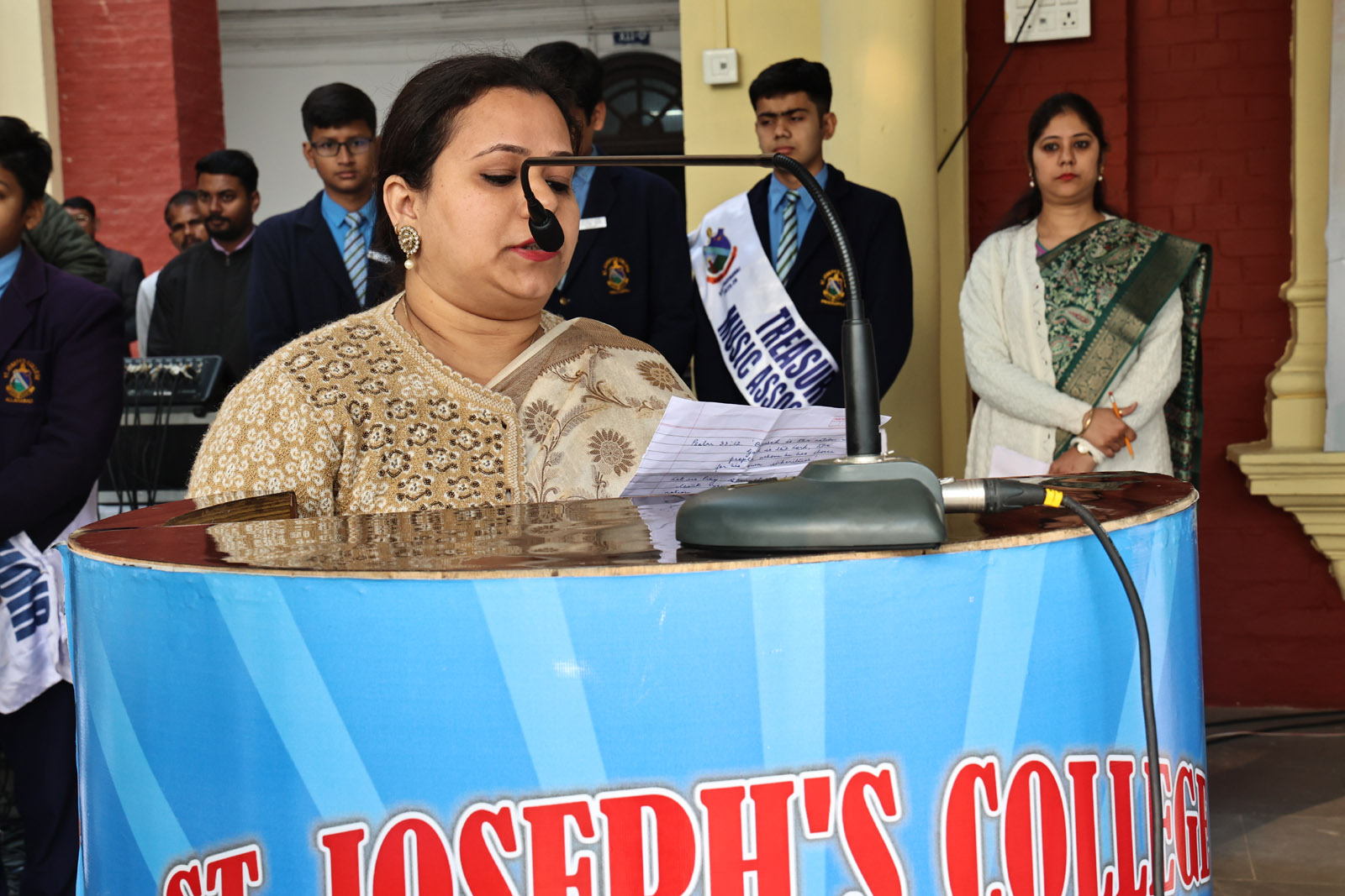 The programme commenced with the welcome of the honoured guests. The proceedings were efficiently conducted by the College Vice Head Marshal, Shaurya Goswami. The formal inauguration took place with a Bible reading and prayer by Ms Priyansha Simon, followed by a melodious prayer hymn presented by the School Choir, setting a reverent tone for the occasion.