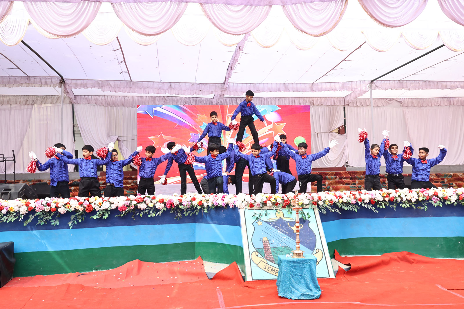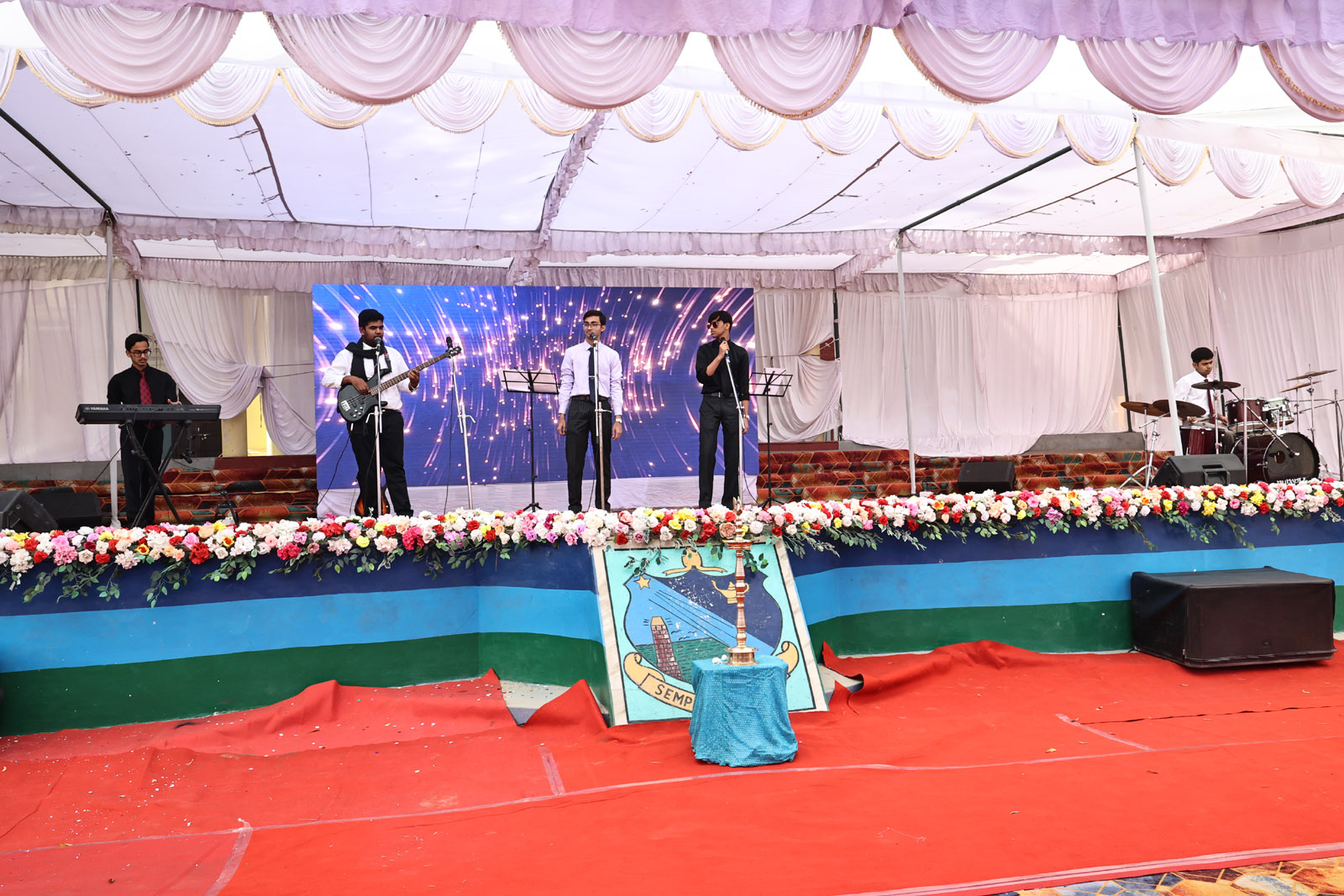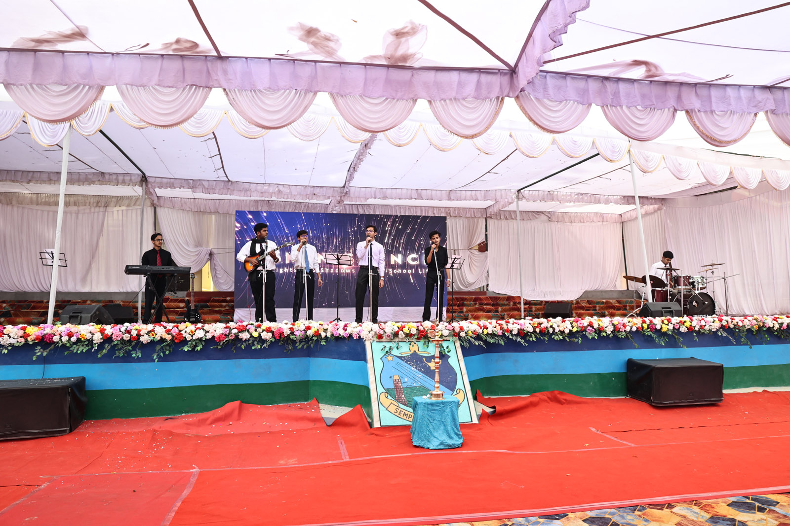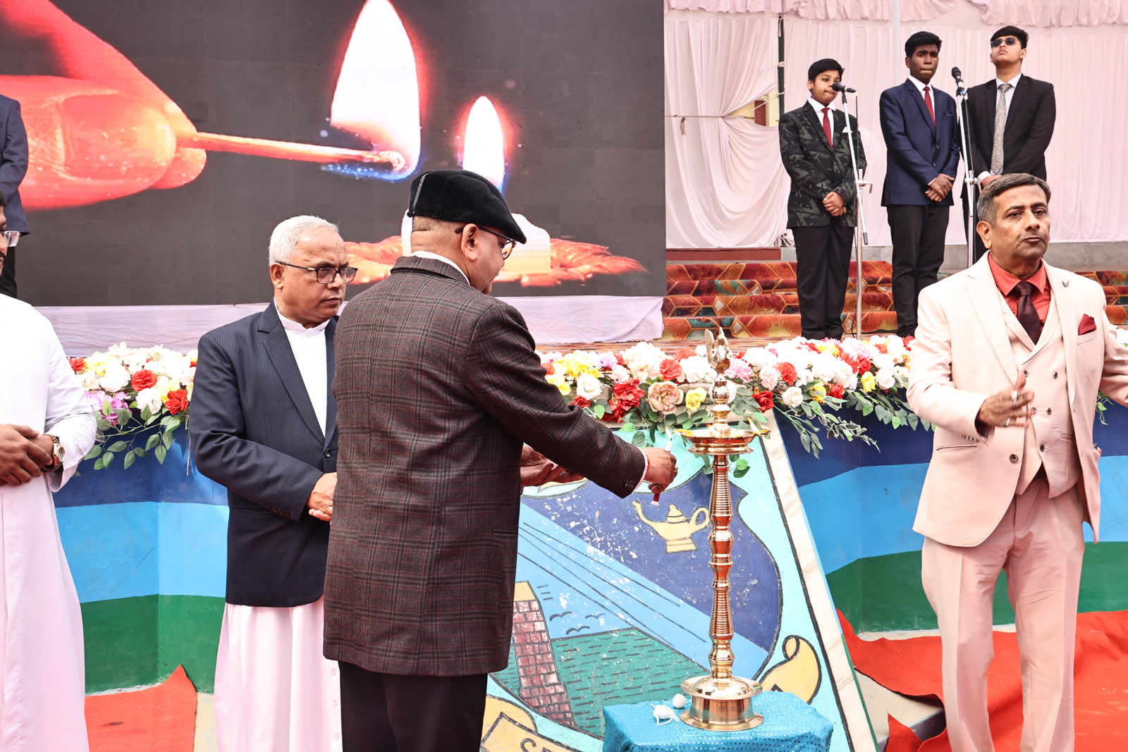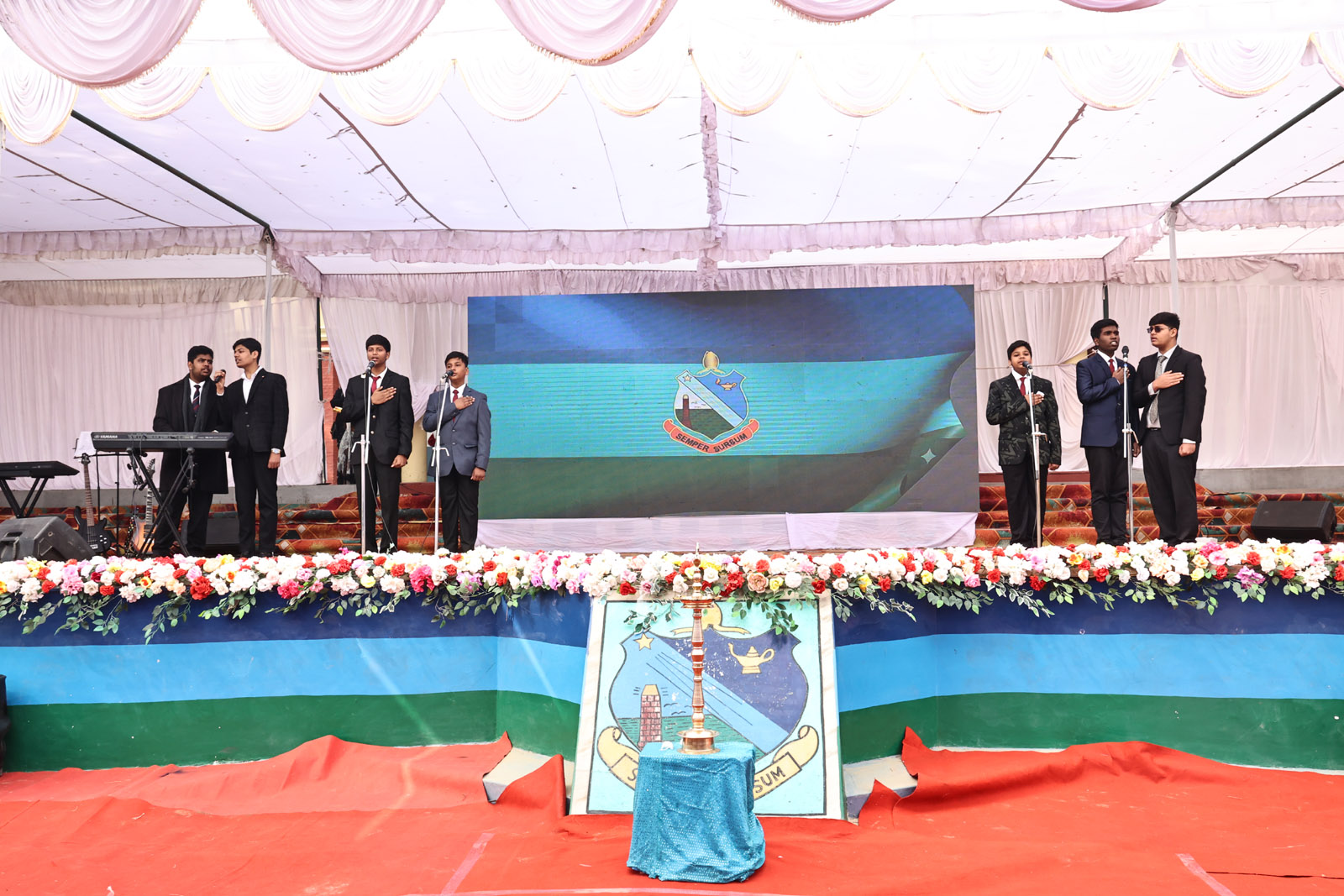 The programme commenced with a gracious Welcome Address by Stavya Agrawal, followed by the Lighting of the Ceremonial Lamp by members of the administration, the Staff Coordinator, the Reverend Fathers, and the Parent Representative, Mr. Amit Mishra, symbolising the illumination of knowledge and wisdom. The College Anthem, sung by the College Choir, filled the hall with pride and unity, after which Saransh John led the gathering in prayer. Adding a delightful touch, students of Classes I to V presented a Prayer Song and Dance, captivating the audience with their innocence and enthusiasm.
