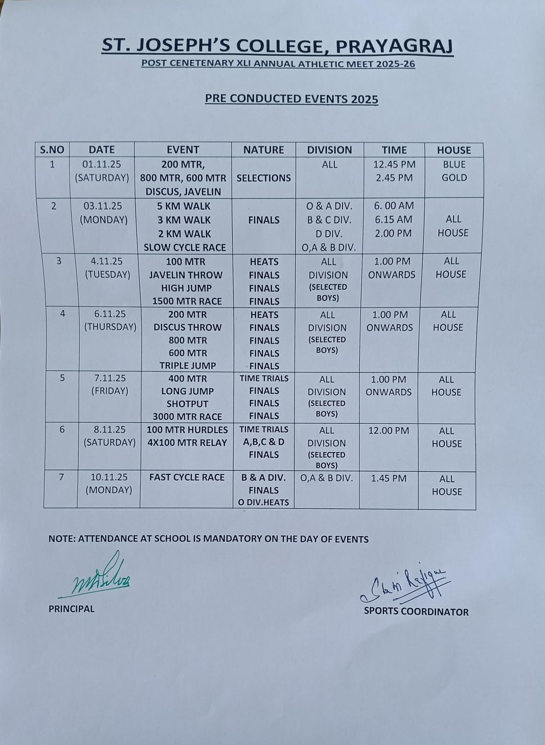 Dear Parents of Classes 3 to 12, The pre-conducted events scheduled for tomorrow (01.11.2025) are as follows: Events: 200 m Race: O, A, B, C, D, E & F Divisions 800 m Race: O, A & B Divisions 600 m Race: C Division Discus Throw: O, A, B, C & D Divisions Javelin Throw: O, A, B & C Divisions Reporting Time: Blue House: 12:45 p.m. Gold House: 2:45 p.m. Note: Parents are requested to wait in the Waiting Lounge near the gate during the events. The finals of the Pre-conducted Events will be held from 03.11.2025. The details of the events and their timings are provided in the list attached. Participants are required to report in proper sports attire, and attendance is compulsory for all selected participants on the day of the events. Kindly adhere to the given timings and dress code (House T-shirt is compulsory). Please Download the attachment schedule list Regards, Principal St. Joseph’s College