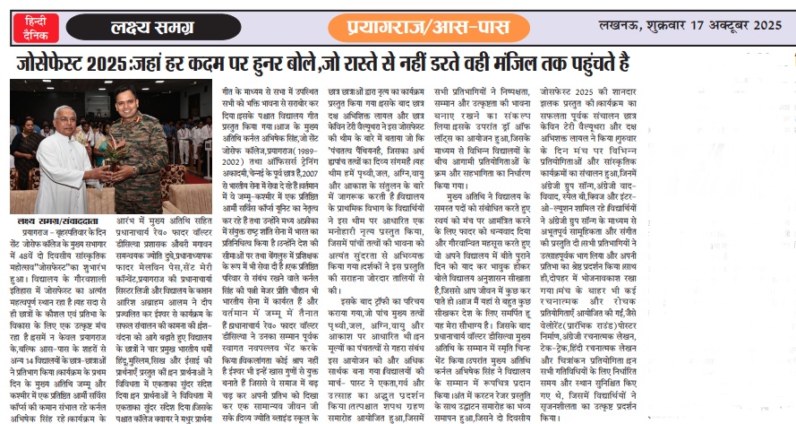 The inaugural day of Josephest 2025, the annual scholastic and cultural symposium hosted by St. Joseph’s College, Prayagraj, was successfully held on 16th October, 2025. The proceedings gathered a significant contingent of regional educational institutions, including St. John’s Co-ed Naini, Maharishi Vidya Mandir, Prayagraj, Bal Bharti School, Prayagraj , Bethany Convent School, Naini, St. Peter's School, Raebareli, St. Joseph's School, Meja, St. Joseph's Girls Wing, Prayagraj, Srinivasa Ramanujan Public School, Prayagraj, St. Mary's Convent Inter College, Prayagraj, St. Joseph's School, Kaushambi, St. John's Academy, Karchana, St. Joseph's School, Naini, and I.P.E.M International School, Prayagraj, alongside the host institution, St. Joseph’s College, Prayagraj.