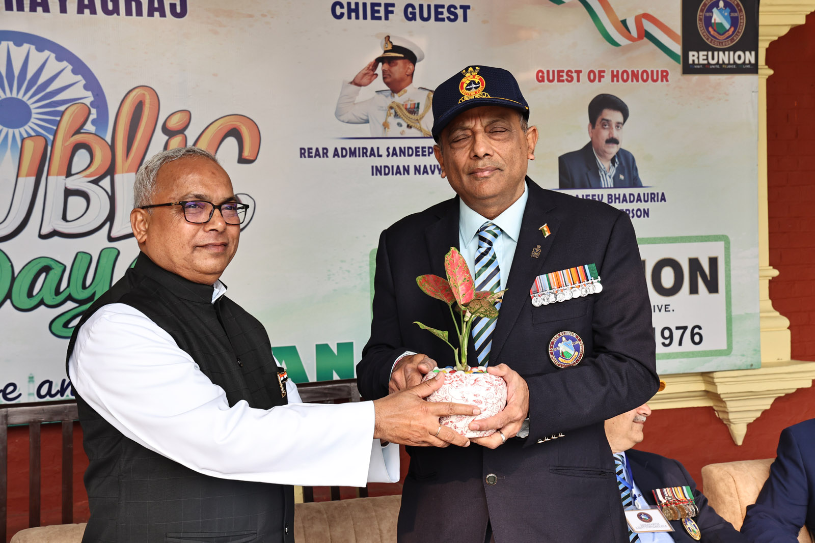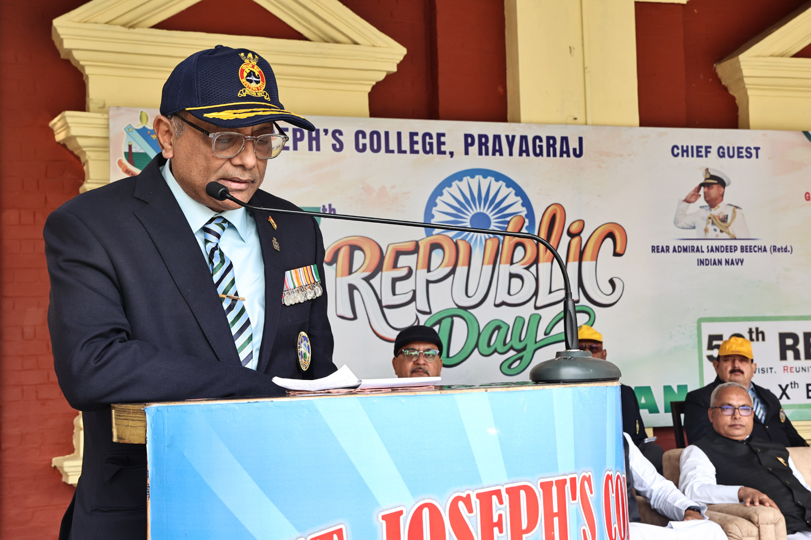 Subsequently, Ms M. Paul introduced the Chief Guest, Rear Admiral Sandeep Beecha (Retd.), a distinguished alumnus of the 1976 batch of St. Joseph’s College, Prayagraj. His inspiring journey from the Merchant Navy to the Indian Navy stands as a shining example of discipline, leadership, and unwavering dedication to the nation. After the introduction, he was honoured with the presentation of a sapling as a mark of respect.