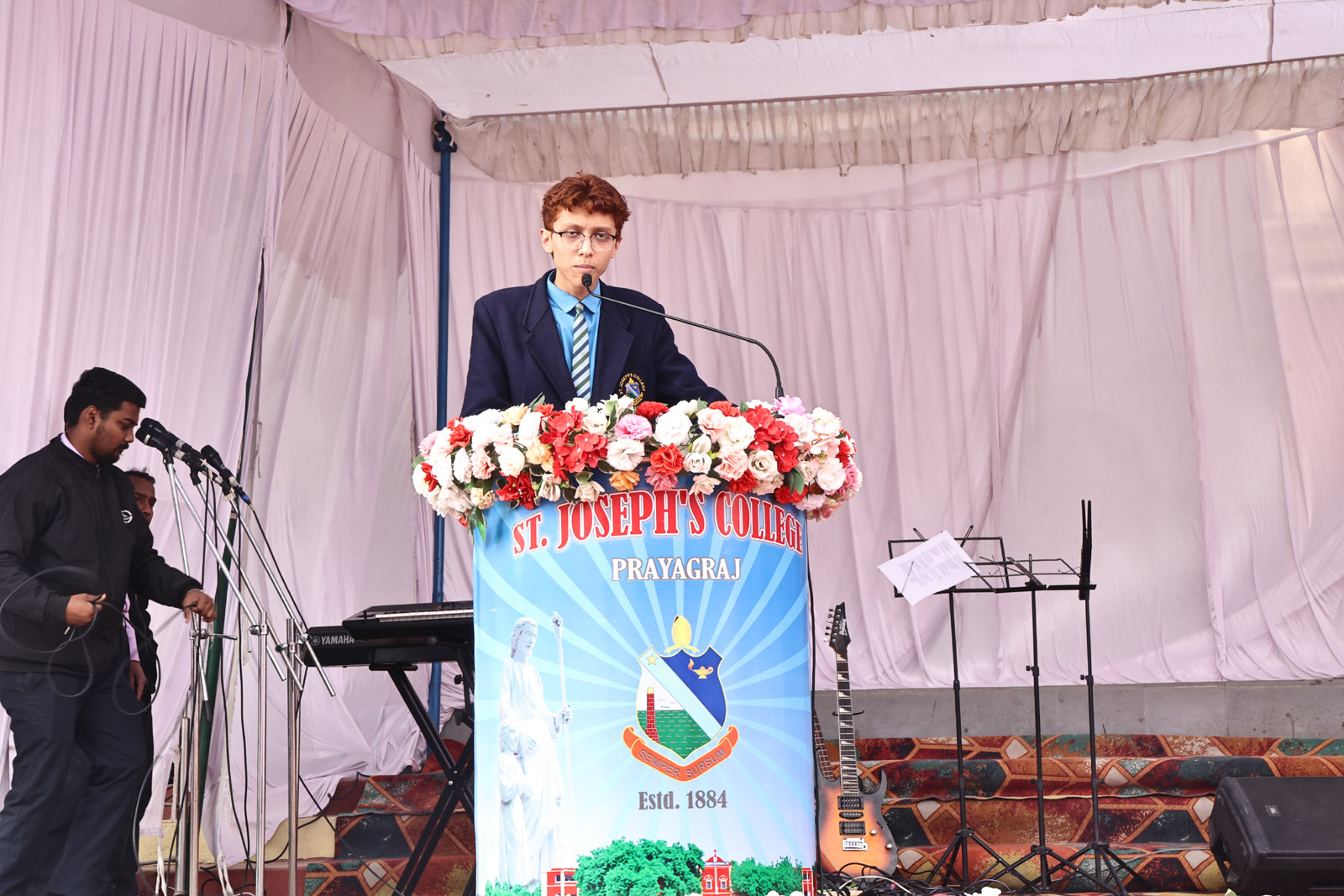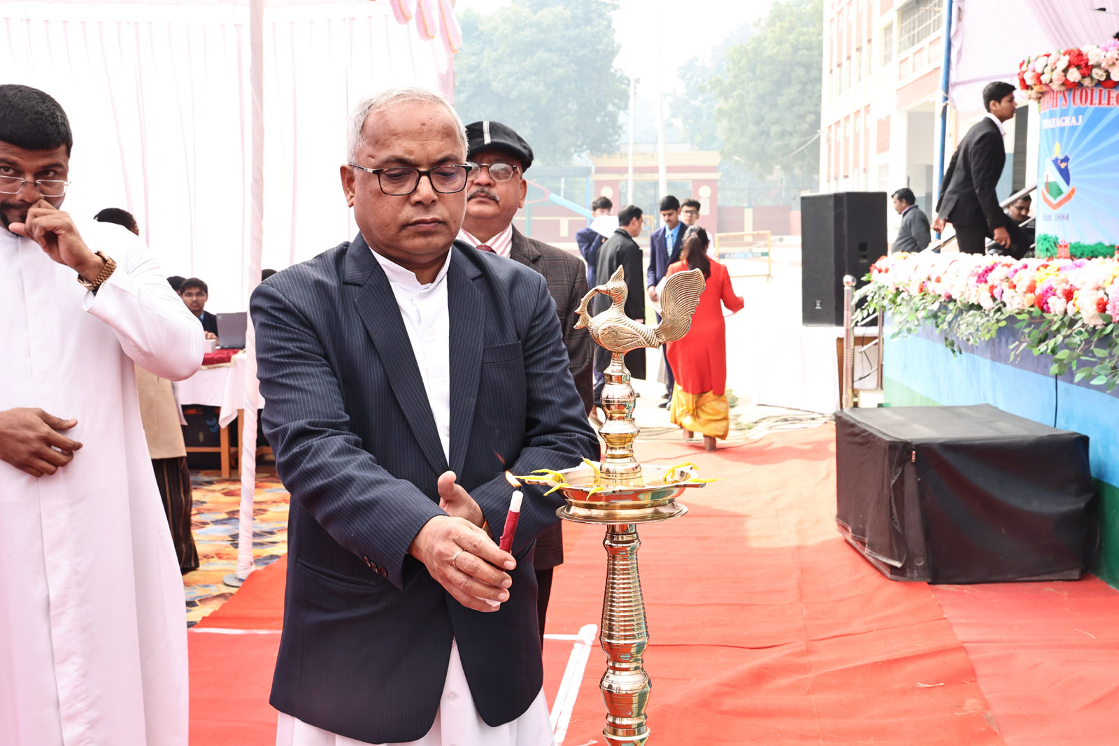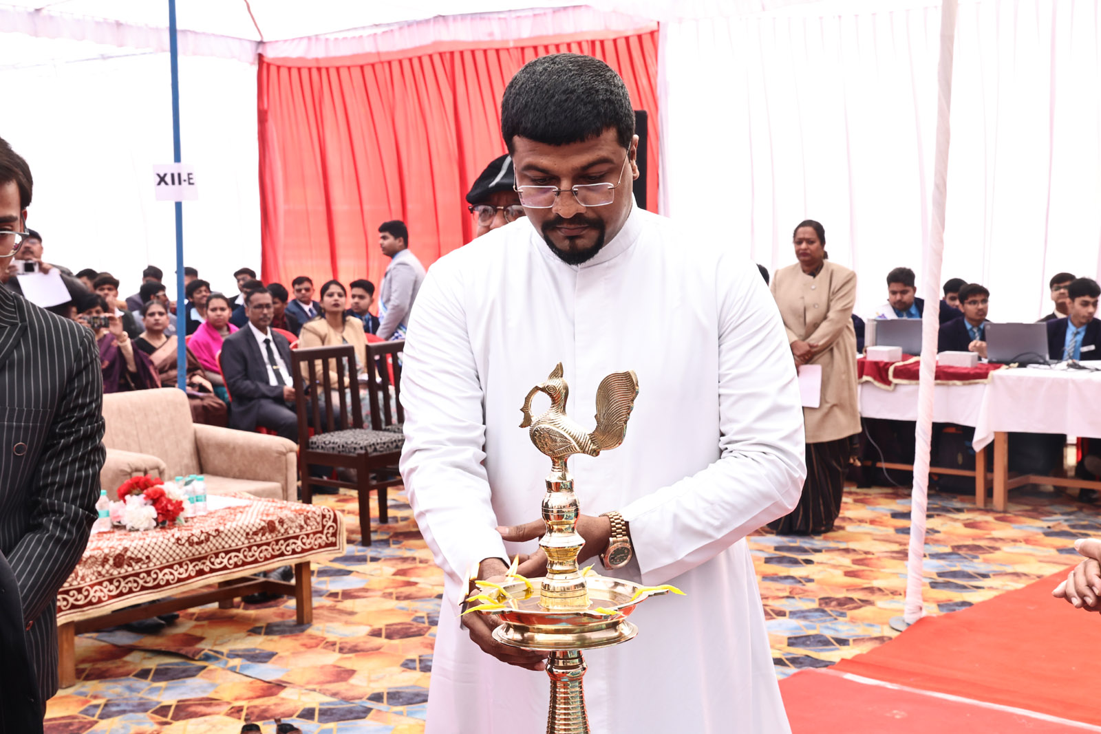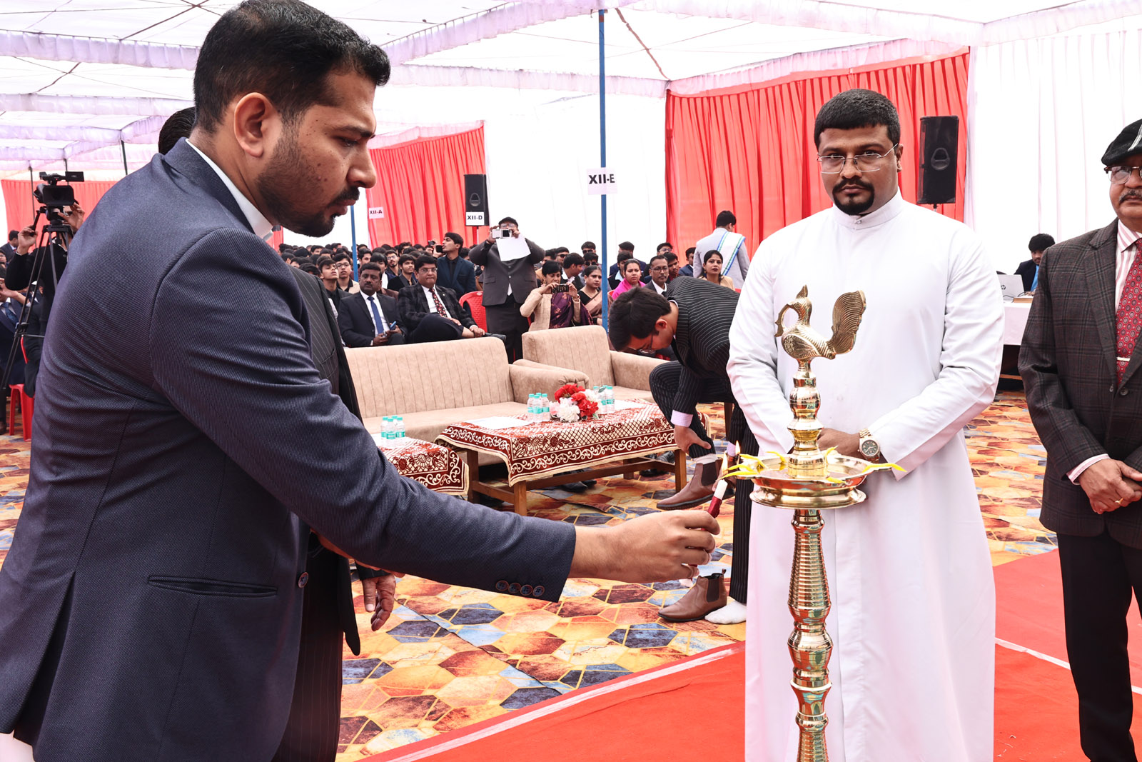 The programme commenced with a gracious Welcome Address by Stavya Agrawal, followed by the Lighting of the Ceremonial Lamp by members of the administration, the Staff Coordinator, the Reverend Fathers, and the Parent Representative, Mr. Amit Mishra, symbolising the illumination of knowledge and wisdom. The College Anthem, sung by the College Choir, filled the hall with pride and unity, after which Saransh John led the gathering in prayer. Adding a delightful touch, students of Classes I to V presented a Prayer Song and Dance, captivating the audience with their innocence and enthusiasm.